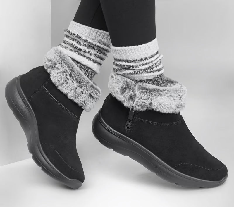 Stay warm and cozy all season wearing Skechers On-The-GO® Encore - Snow-Capped. This cute ankle bootie features a 3M® Scotchgard® treated suede upper with a plush faux fur collar, side-zip closure, Skechers Air-Cooled Goga Mat™ insole, and an ULTRA GO® cushioned midsole.
